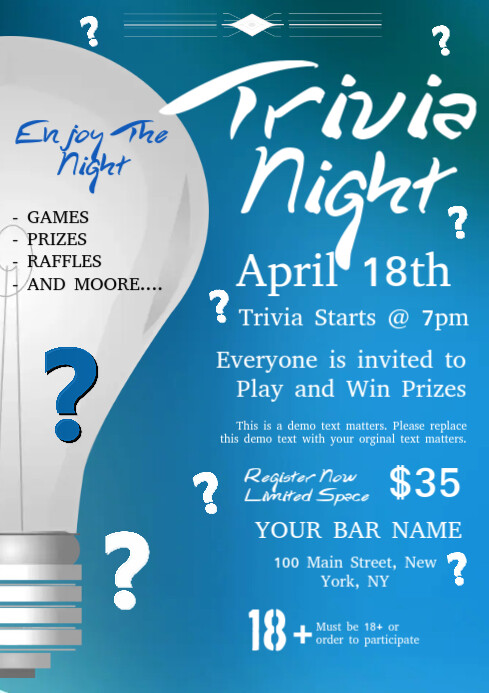 Other events include a trivia night flyer for pub quizzes, a flu shot drive template for health promotion, and flyers for clothing drives. Try our easy-to-use design tools or choose one of our thousands of templates. This can be use for Trivia Party, Quiz Night, Quiz Party, Trivia Day, Pub Quiz or So-Called Pub Quiz and others.